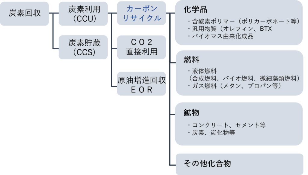 ・カーボンリサイクルは二酸化炭素回収・有効利用(CCU)にあたり、その化合物の種類によって化学品、燃料、鉱物、そのほかに分類することができる