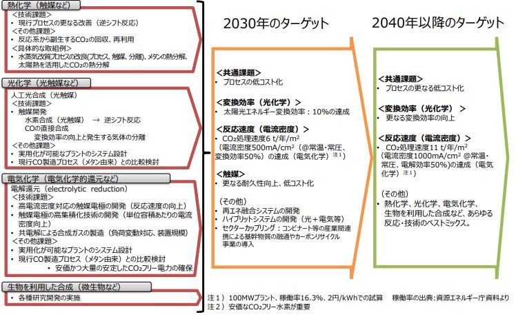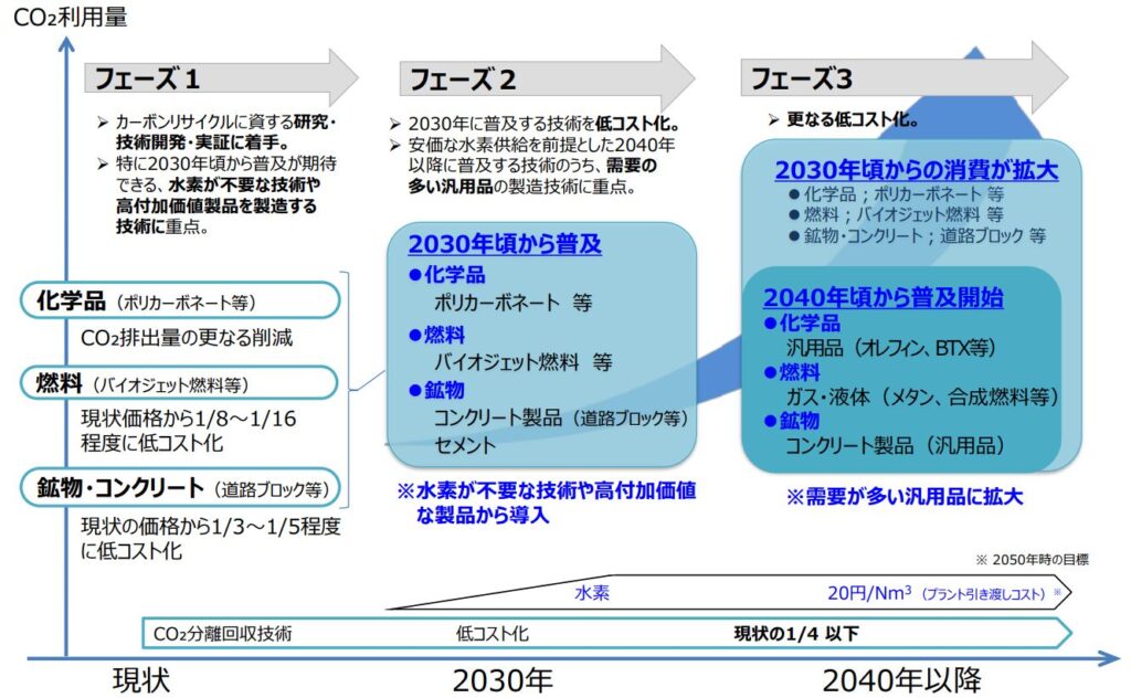 ロードマップでは、2030年を比較的短期のターゲットとし、技術確立がしやすい二酸化炭素が入手しやすい環境に力を入れようとしています。さらに2040年以降を中長期のターゲットとして定め、二酸化炭素の利用量が多いものに展開できるように考えています。