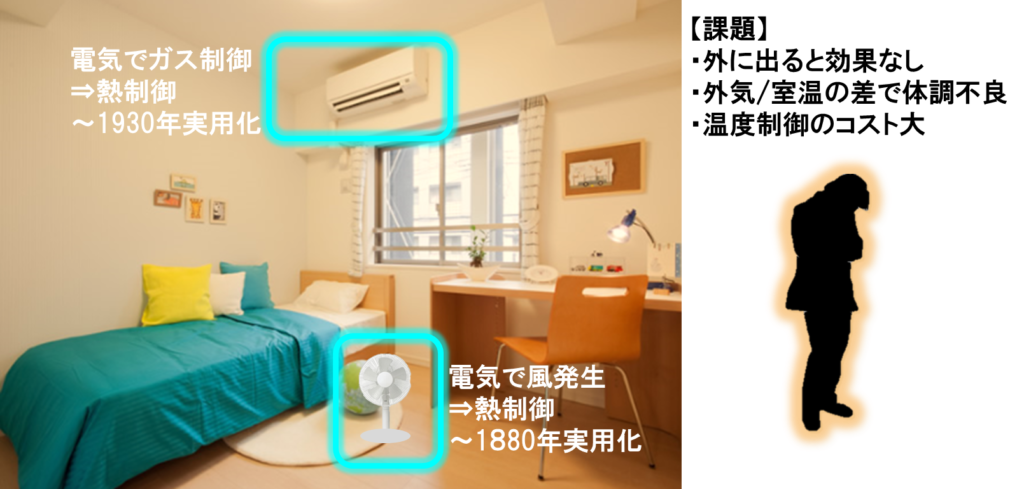 従来、温度を制御する方法としては扇風機(~1880年実用化)やエアコン(~1930年実用化)が活躍してきました。こうした機器は、エネルギー消費しながら、ある特定の生活空間の温度を下げる(もしくは温める)という役割を果たし、今では生活に欠かせない製品となっています。
