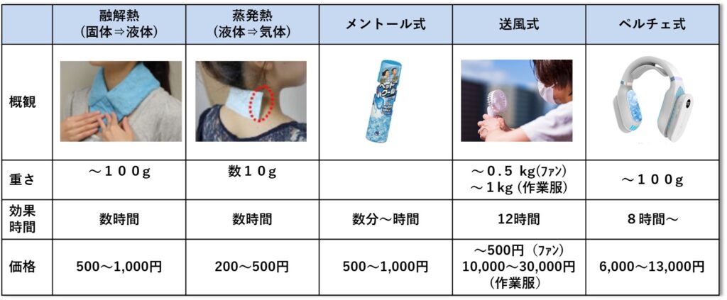 ・暑さ対策グッズの種類は熱を制御する方法によって分類できる。物質の融解熱、蒸発熱、メントールなどの化学物資、送風、ペルチェ機構などの機構を活用したものがある