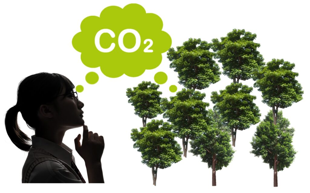 国立環境研究所が発表した資料によりますと、平均的な日本人が排出する二酸化炭素の量は約8トンとなっています。二酸化炭素は通常気体のため、どのくらいの量かイメージすることが難しいですが、一本の木が一年間に吸収する二酸化炭素の量が14キログラムですので、大まかに樹木600本分の二酸化炭素を一人一人が毎年排出していることになります。