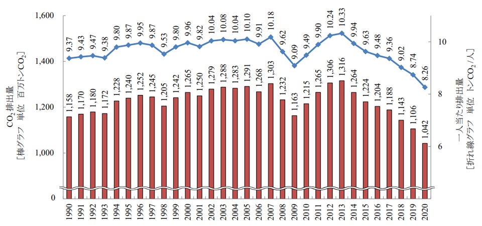 なお、一人当たりの二酸化炭素排出量には個人差があり、またさまざまな考え方や計算方法もあります。今回紹介した値は、一般の家庭生活に直接関係している二酸化炭素排出量を計算し、日本の人口で割って一人当たりの排出量を計算しています。