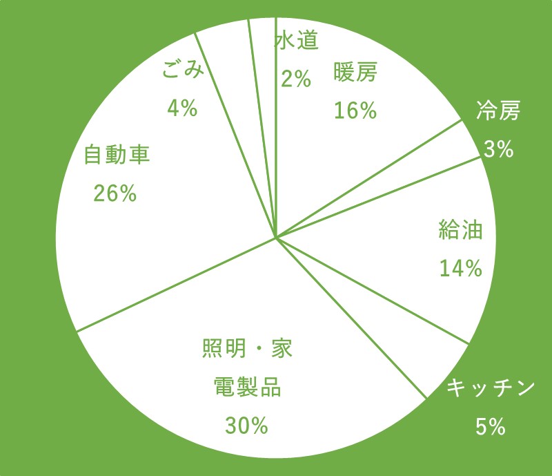 温度の調整にはエネルギーが必要なため、エアコンや温水などの利用によって二酸化炭素を排出されていることが分かります。照明は家電製品など普段あまり意識していないところでも、知らずに電気を消費して温室効果ガスもまた排出しています。また、私達が移動にもエネルギーが必要で、とくにガソリン自動車を利用している場合には、二酸化炭素の排出がおおくなっています。