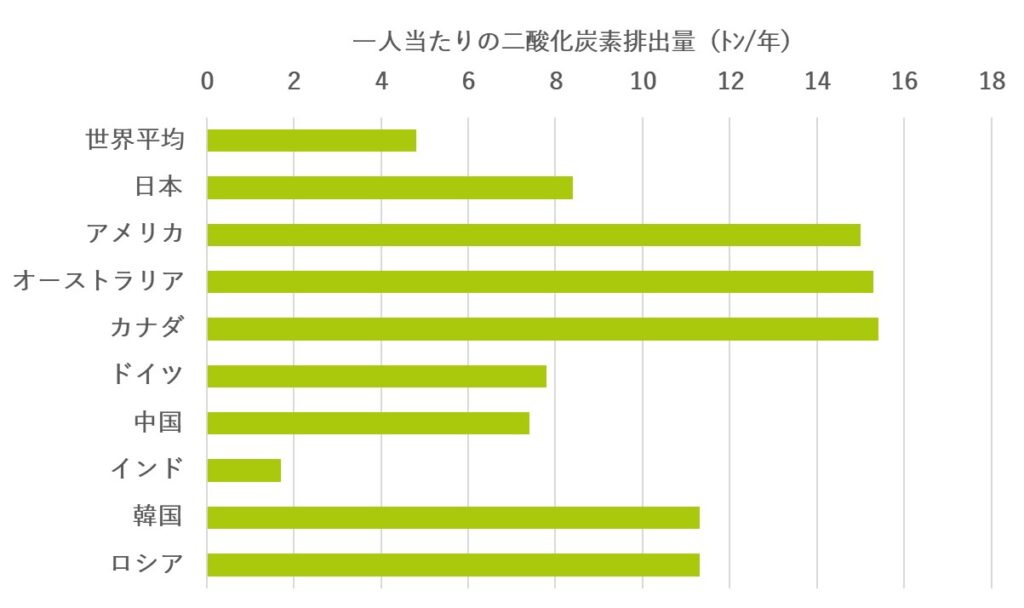 なお、日本に住む人の一人当たりの二酸化炭素排出量は世界の平均の約2倍の量になっています。同様の排出量を有している国としてドイツが挙げられます。先進国の中で一人当たりの二酸化炭素排出量が最も多い国がアメリカ、カナダ、オーストリアなどの資源国で、ついで韓国やロシアが続いています。なお、中国やインドは国としてみたあたりの二酸化炭素排出量は多いですが、人口も多く、一人当たりの排出量は中国で平均程度、インドでは世界平均よりも低い量となっています。