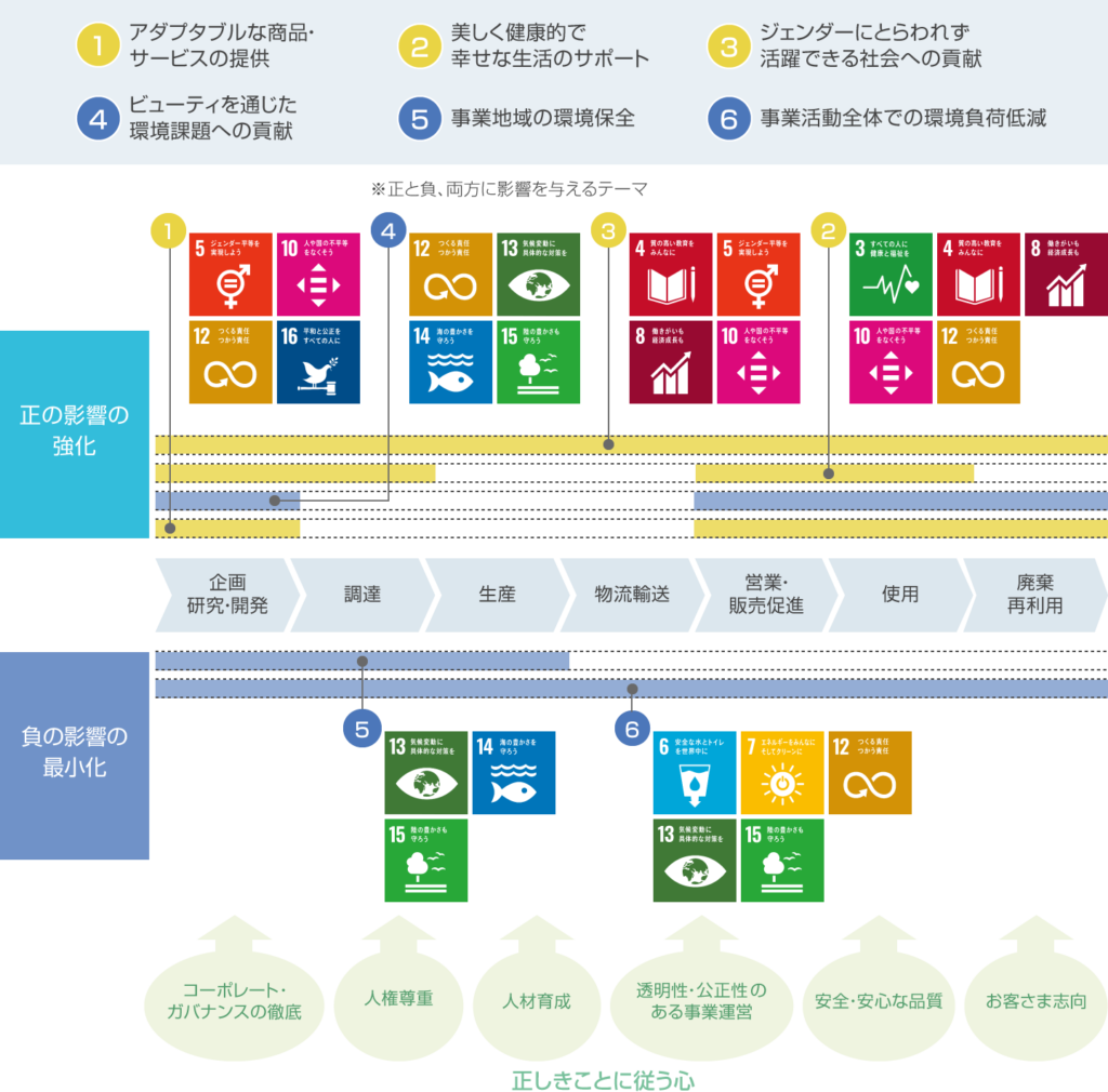 コーセーは、おもに化粧品の製造、販売を行う企業であり、「正の影響の強化」として「SDGs3(健康)SDGs5(男女平等)SDGs10(不平等の解消)」などを挙げており、事業を通して、「美しく健康的で幸せな生活のサポート」や「ジェンダーにとらわれず活躍できる社会への貢献」などを強調しています。