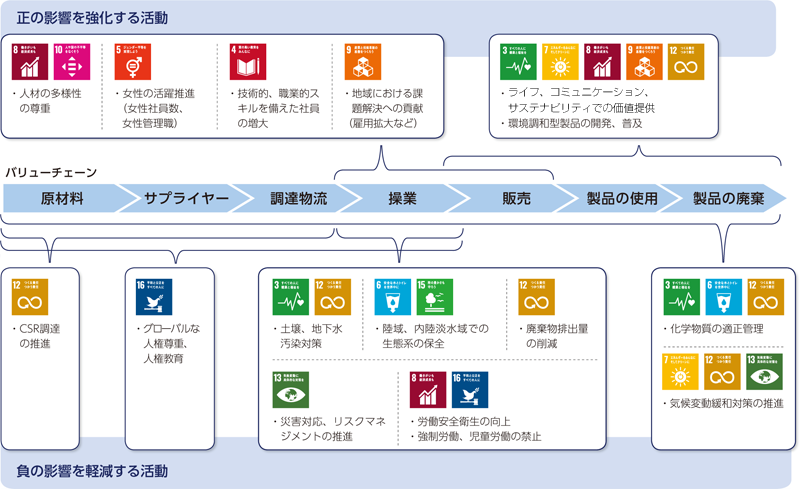 なぜこんなにもたくさんの取り組みをあげられているのか?その答えの1つは「バリューチェーン(1つの製品が顧客のもとに届くまでには、さまざまな一連の業務活動)」を見渡し、「良い影響(正の影響)だけでなく悪い影響(負の影響)」も合わせて分析しているからです。