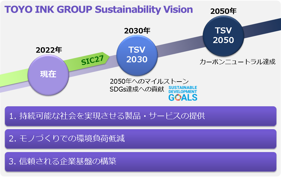東洋インキでは、材料を提供していることから、事業を通して次の3つを掲げています。