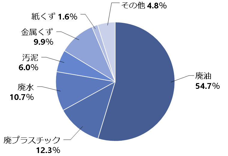 2020年度における国内の廃棄物外部排出量※は10,822tでしたが、その内訳は、廃油55%・廃プラスチック12%・廃水10%と上位3種で約8割を占めています。