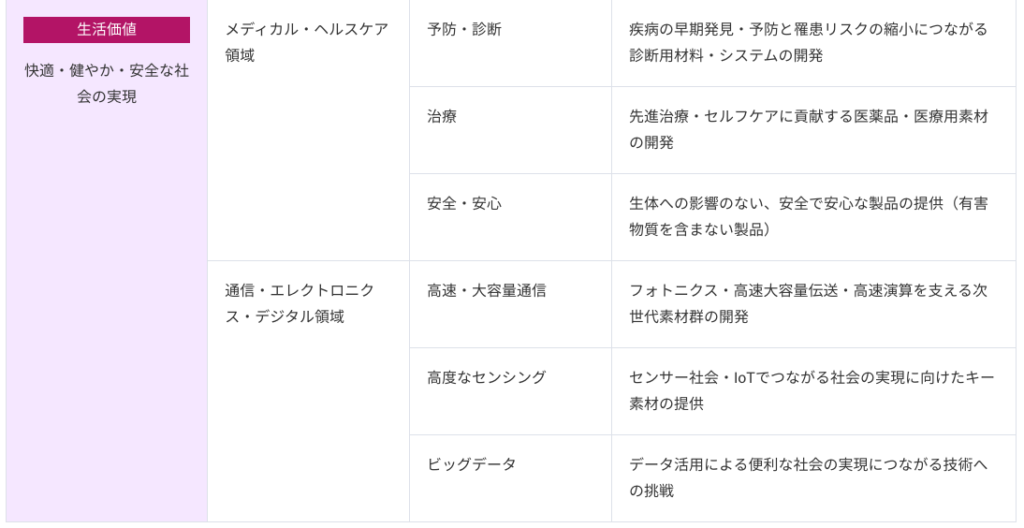 この定義拡張により、IoT・高速通信用デジタル関連素材やセンサー材料(自動運転の安全性、住環境の快適性)、バイオ・メディカル関連素材(医療、創薬、ヘルスケア)など、さまざまな生活価値を機能・特長とする製品群が加わります。