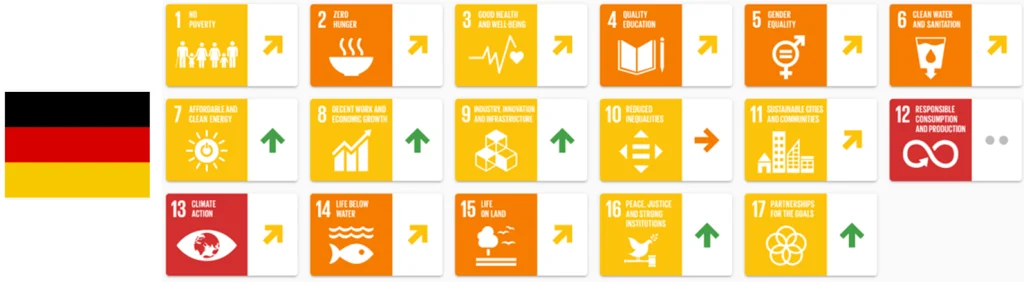 ドイツのSDGs評価パネル(2022)を見てみると、昨年からの改善で比較した場合(矢印の向きをチェックすると)、ほとんどの項目が改善(↑または↗︎)されていて、改善傾向的にSDGsの取り組みがなされていることが分かります。