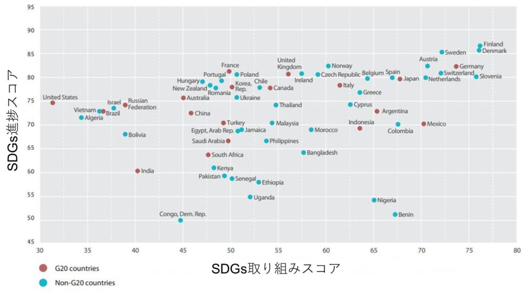 2020年のSDGsに対する政府の取り組みスコアは、60カ国以上を対象に集計されました。下記の図は、各国の取り組みスコアに対して、SDG進捗スコアを表したものです。