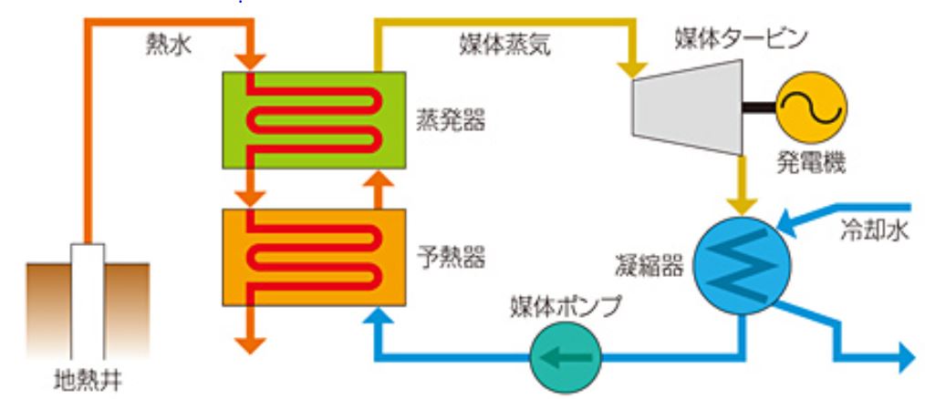 現在、新エネルギーとして定義されている地熱発電は後者のバイナリー方式のものに限られています。バイナリー方式は、地熱流体の温度が低く、十分な蒸気が得られ ない時などに、地熱流体で沸点の低い媒体(例:ペンタン、沸点36℃)を加熱し、媒体蒸気でタービンを回して発電するものです。