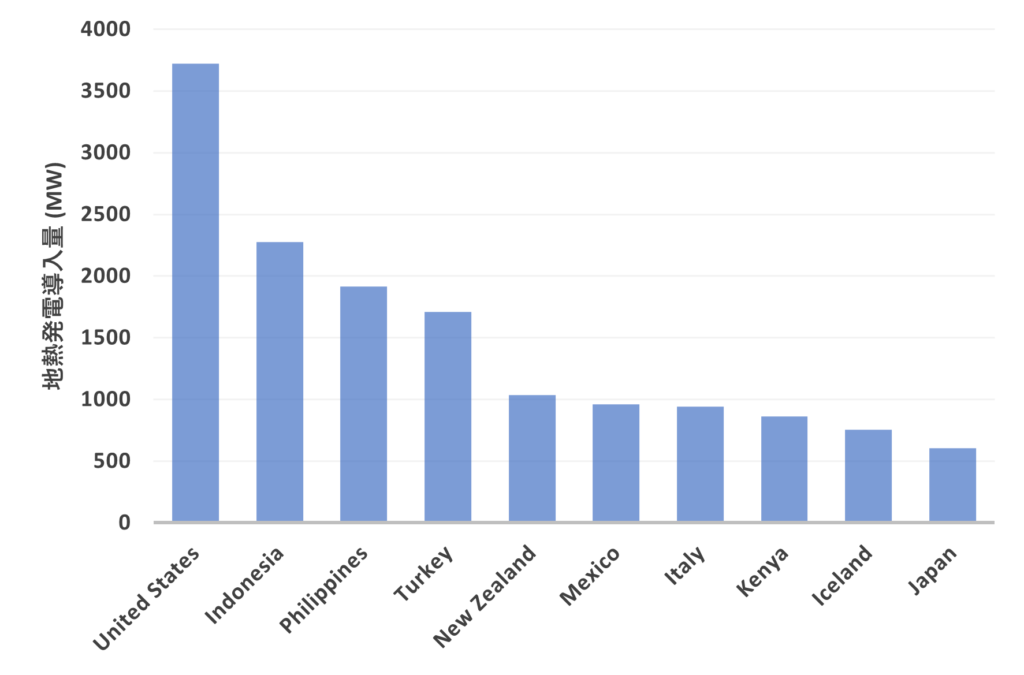 上図は、2021年における各国での累計の地熱発電量になります。アメリカが地熱発電の導入量で世界をリードしていることが分かります。ついでインドネシア、フィリピン、トルコの順となっています。