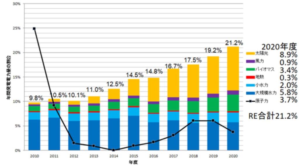 具体的に、下のグラフは2010年から2020年までの再生可能エネルギーの比率の推移したものです。日本は地熱資源を多く保有しているにも関わらず、地熱発電の普及率は再生可能エネルギーのなかでは一番低く、0.3%程度になっています。