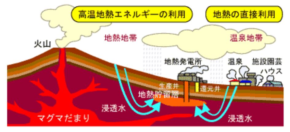 一方、火山や天然の噴気孔、硫気孔、温泉、変質岩などがある、地熱地帯と呼ばれる地域では、深さ数キロメートルの比較的浅いところに同様の熱源があります。地上で降った雨は、こうした地下の高温層まで浸透すると、加熱され蒸気となって地下1000m〜3000m付近に溜まります(地熱貯留層)。