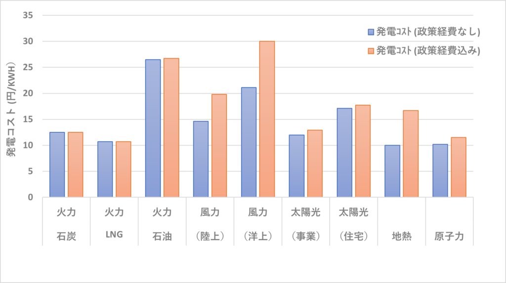 資源エネルギー庁が、2020年の日本における各電源の発電コストを試算しています。これによると、地熱発電は政策経費無し(普及が進むにつれて減少する費用)の場合、最もコストの低い発電方法になるとされています。具体的に、発電コストは9~10円/KWh程度が見込まれています。一方で、現在は少量の地熱発電所のみ運用されているため、発電所に関わる政策(評価・調査、防災、広報、人材育成、発電技術開発、導入支援など)の経費が多く見積もられています。