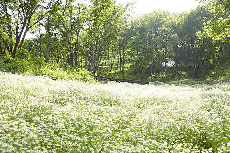 1982年、創業者の北條晴久さんは研究を重ね、有機栽培のカモミールから抽出したカミツレエキスの入浴剤「華密恋」をスタートさせ、7年後に自身の故郷でもある長野県北安曇郡池田町に、「華密恋の湯」が体感できる宿「八寿恵荘」をつくり、当地を「カミツレの里」と名付けました。