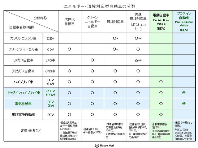 上の表の中には「電動自動車」という種類もあり、電動自動車には「ハイブリッド車・プラグインハイブリッド車・電気自動車・燃料電池車」の4つにマル付されています(緑部分)が、電気自動車と電動自動車は異なる意味で使われます。