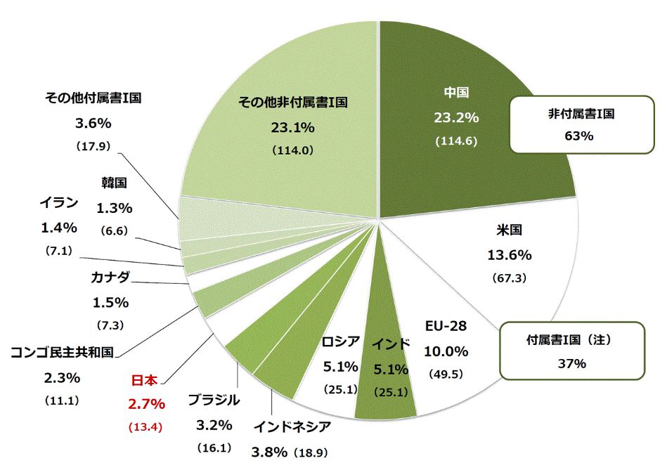 パリ協定が京都議定書と大きく異なり画期的な点は、対象国です。パリ協定では先進国だけでなく、途上国にも温室効果ガスの排出削減を求めています。2016年の温室効果ガス排出量シェアを国別で見ると、中国が23.2%で1位、インドが5.1%でロシアと並んで同率4位となっており、これらの国々を以下に参加させるかが大切なポイントでした。