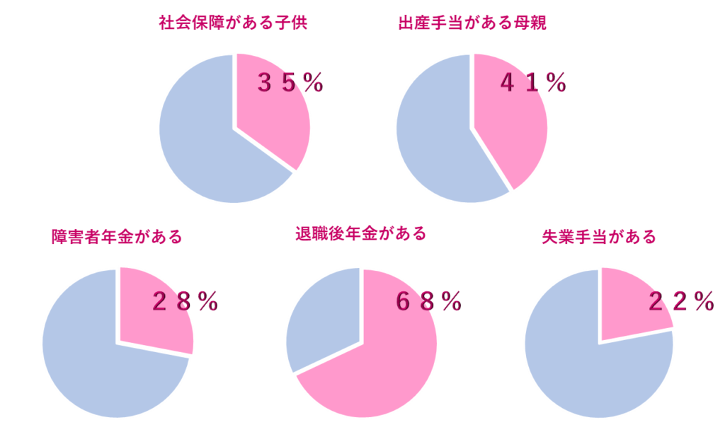 具体的に社会保障は、年金、医療、介護、子ども・子育てなどの分野に分けられ、日本では国の一般会計歳出の約3分の1を占める支出項目となっています。しかし、世界を見渡してみると、社会保障制度がない国もあります。以下に、主な社会保障制度の受けられる人の割合をまとめてみました。