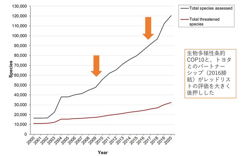 黒線:評価された種の数、赤線:絶滅危惧種の数