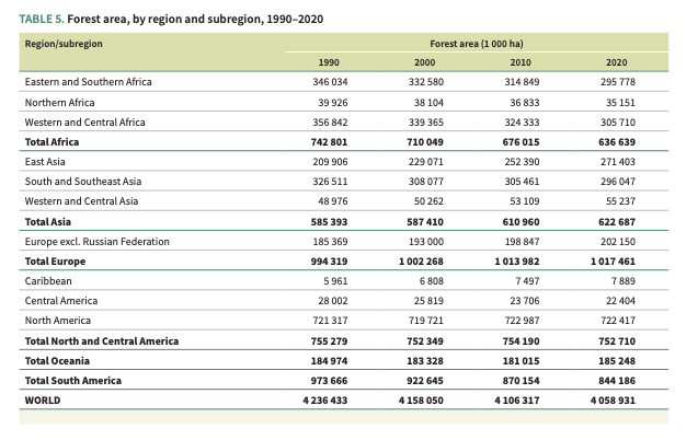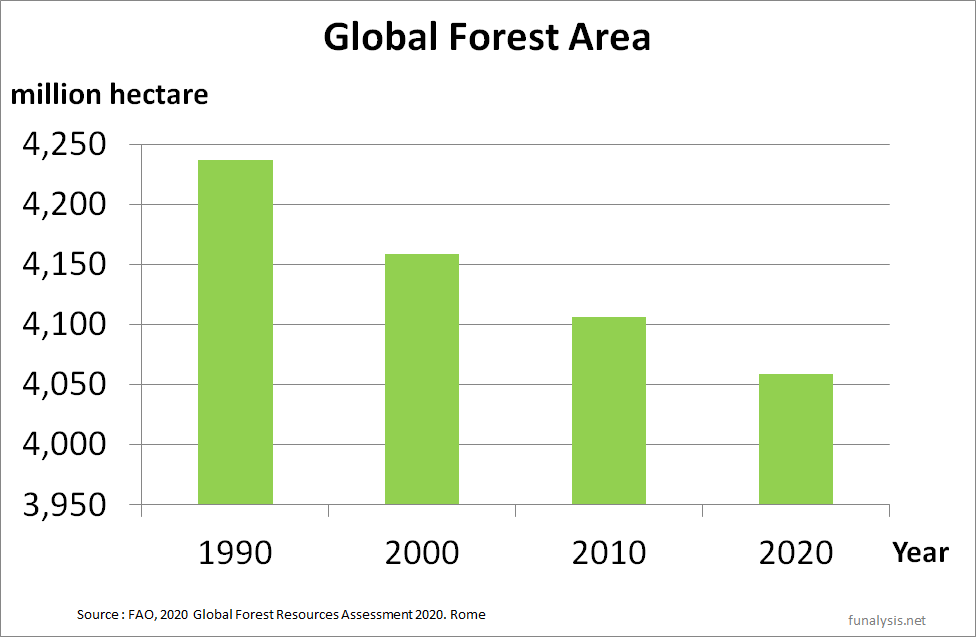 この数十年の世界の森林面積の変化を調べると、次のようになっています。