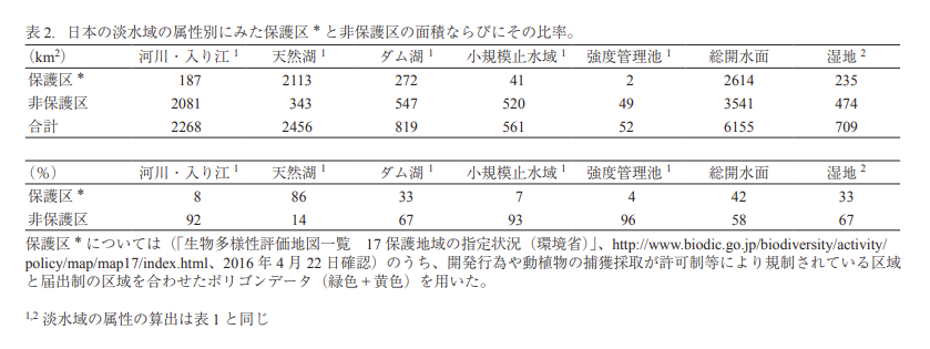 JBO2 では第 II 章第 1 節に「陸域及び内陸水域の約 20.3%が保護地域に指定されている」とあり、日本全土 の内陸水の保護区は十分であるとの認識が示されてい る。